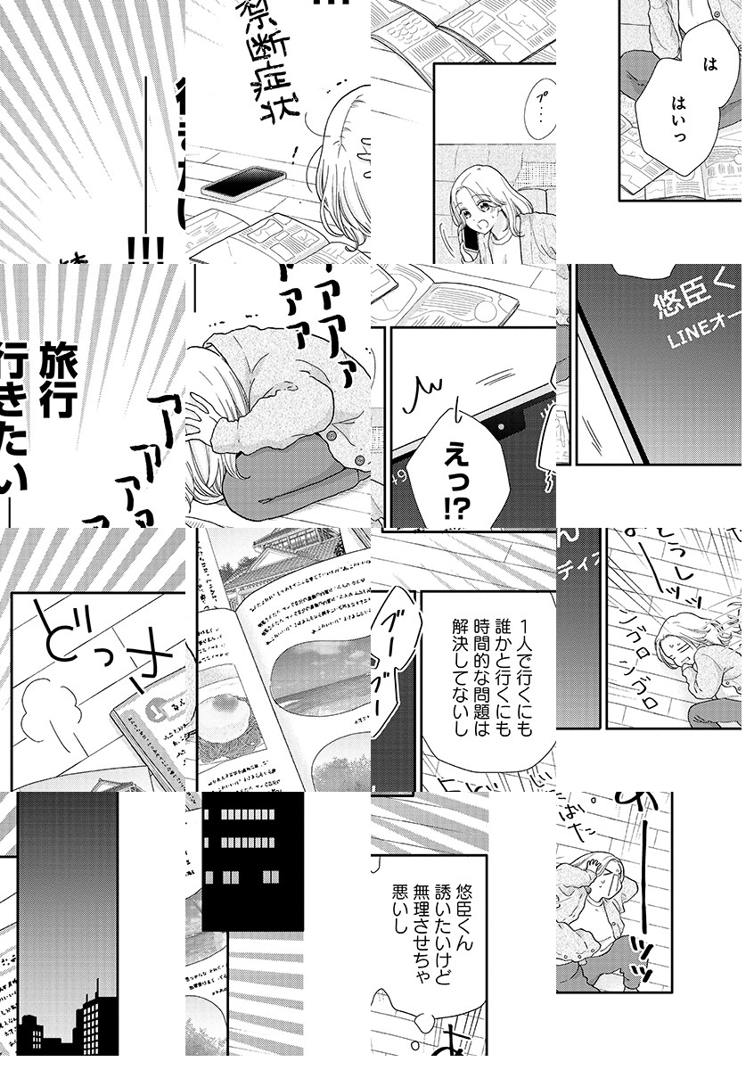 二股モラハラ彼氏にフラれた後に待っていたのは、年下男子との甘い癒しの旅!? 30歳の誕生日を目前に、付き合っていた(はずの)先輩にフラれてしまった派遣OLの涼音。 ヤケクソ気味なひとり傷心旅行中、涼音が出会ったのは、スランプ中の小説家・悠臣。 涼音と過ごす時間が新作小説のヒントになりそうだと直感した悠臣から、「一緒に旅してくれませんか」と頼まれた涼音ですがーー?
